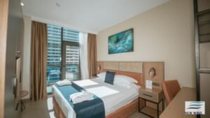 تتميز الغرف هذا الفندق بأنها مكيّفة، وتحتوي على مكتب وغلاية وثلاجة وصندوق ودائع آمن وتلفزيون بشاشة مسطحة وحمّام خاص مجهز بدش، كما تم تجهيز جميع الغرف الموجودة في فندق New Wave Hotel ببياضات أسرّة ومناشف.